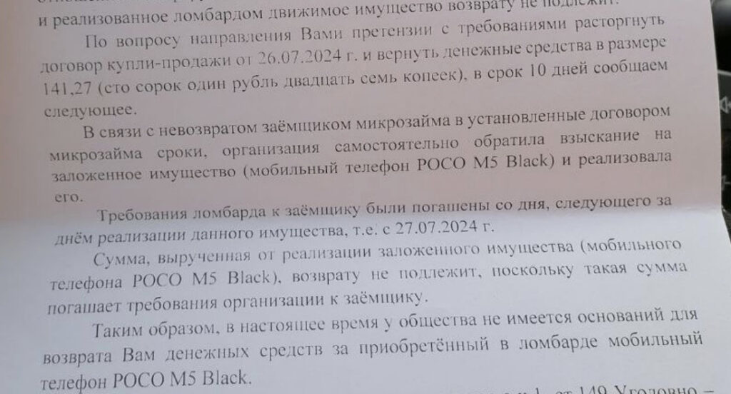 Ответ на претензию все же пришел. Судя по нему, возвращать деньги у ломбарда «Вега Столице» (сеть «Техно Ломбард») нет оснований.
